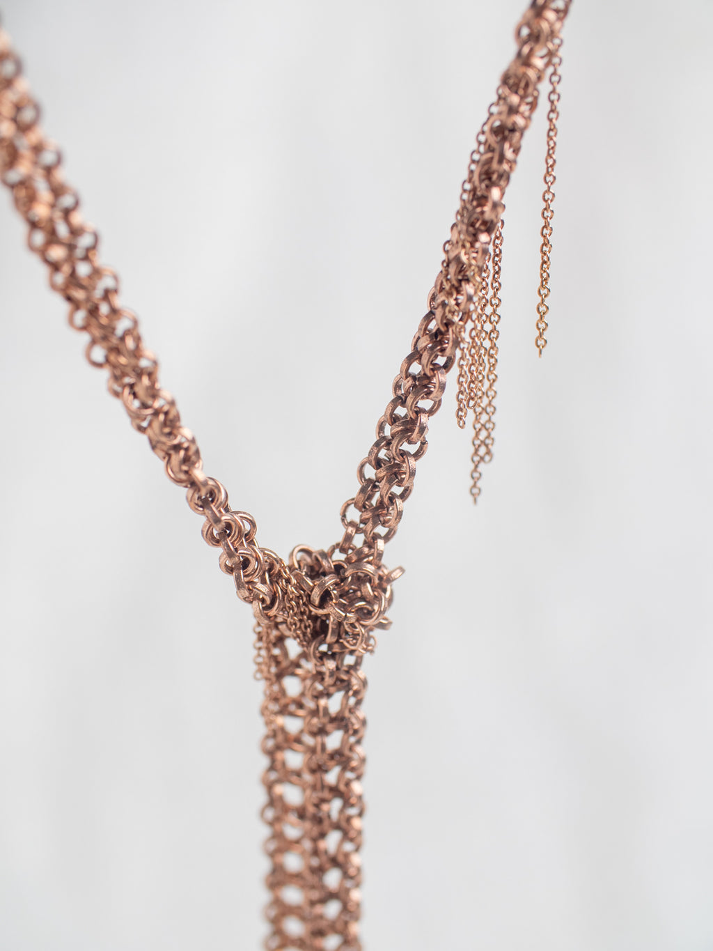It takes over a week for our skillful artisans to assemble each copper mesh. This specific metal is also known for its healing virtues that we finalize with a layer of rose gold on top. It's a quality that is a pleasure to feel on your skin...